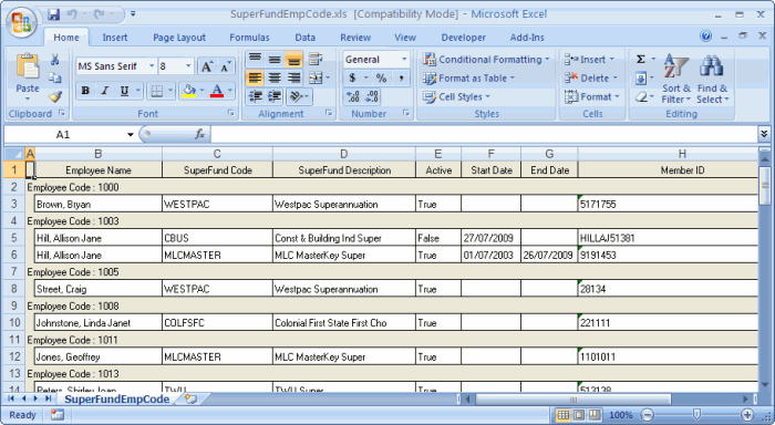 This example explains how to group the Employee Super Funds grid by Employee Code to check employees who are attached to multiple superannuation funds.