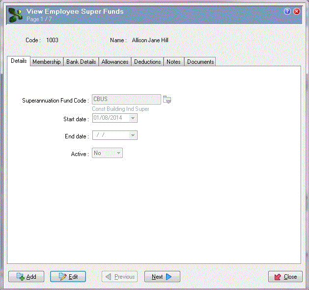 Currently, Allison is not a member of the CBUS superannuation fund. Superannuation payroll rules will not use this Employee Super Funds record to generate transactions. |