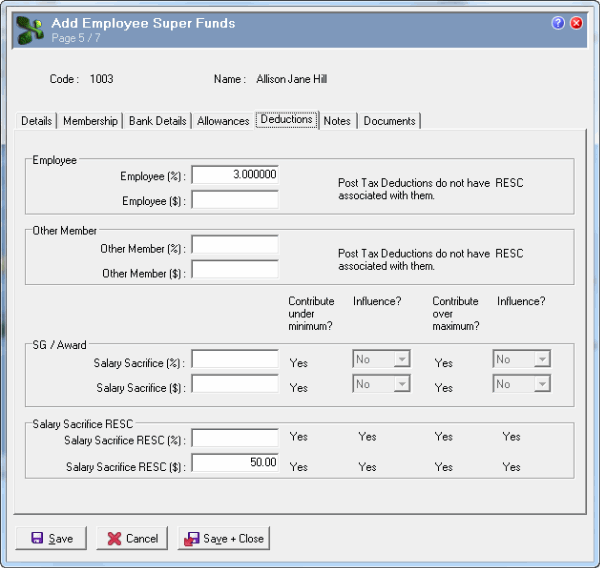 Note: Influence? fields are enabled when Salary Sacrifice (%) or ($) is greater than 0.00. |