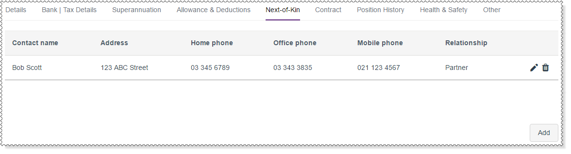 Your next-of-kin details are displayed in a grid. Your manager may also be able to edit this information.