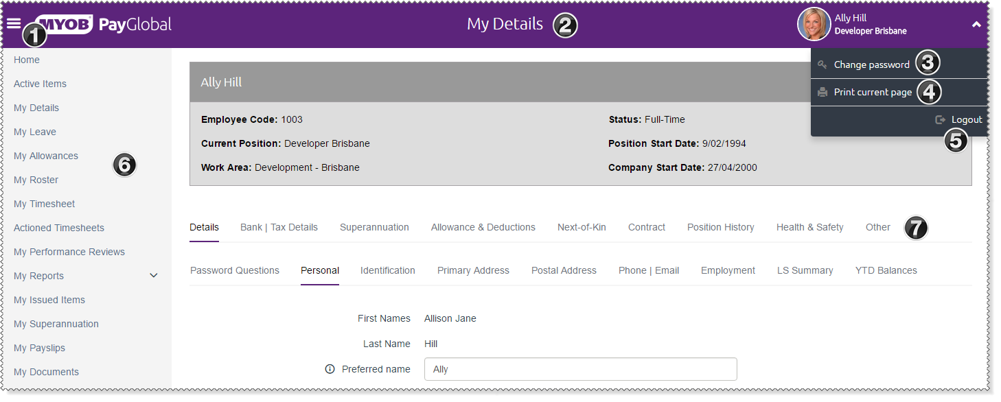 The following image shows the main navigation features of the Self-Service website.