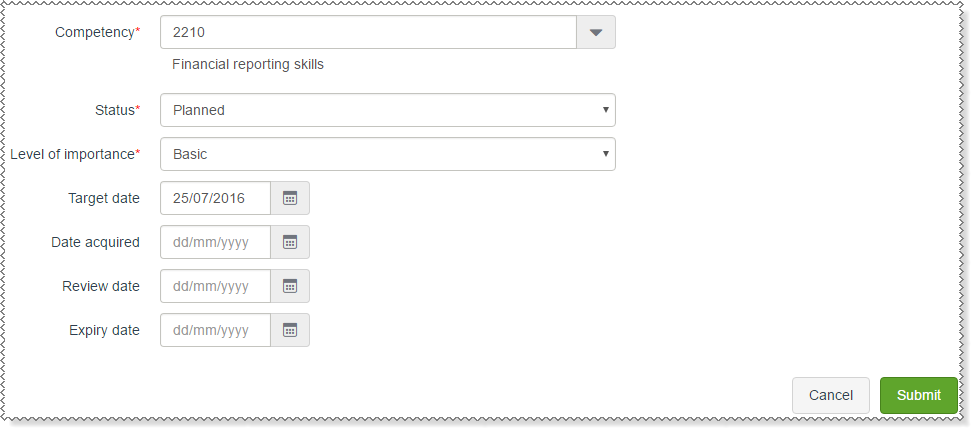 Important: After you submit a new competency, the employee record is not updated until you click the Submit button below the Qualifications grid.