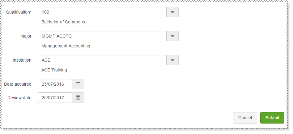 Important: After you submit a new competency, the employee record is not updated until you click the Submit button below the Qualifications grid.