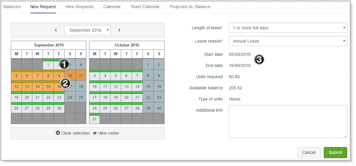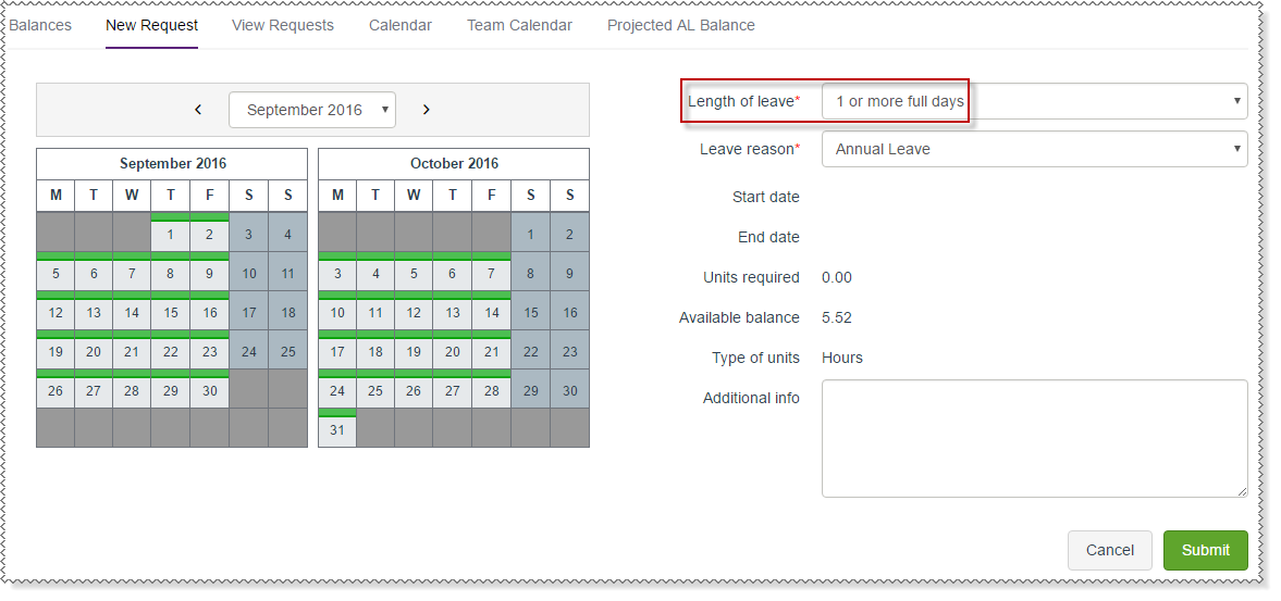 When you select days in the calendar, the Start date, End date and Units required fields are updated. Units required displays "0" if you need to key your hours. |