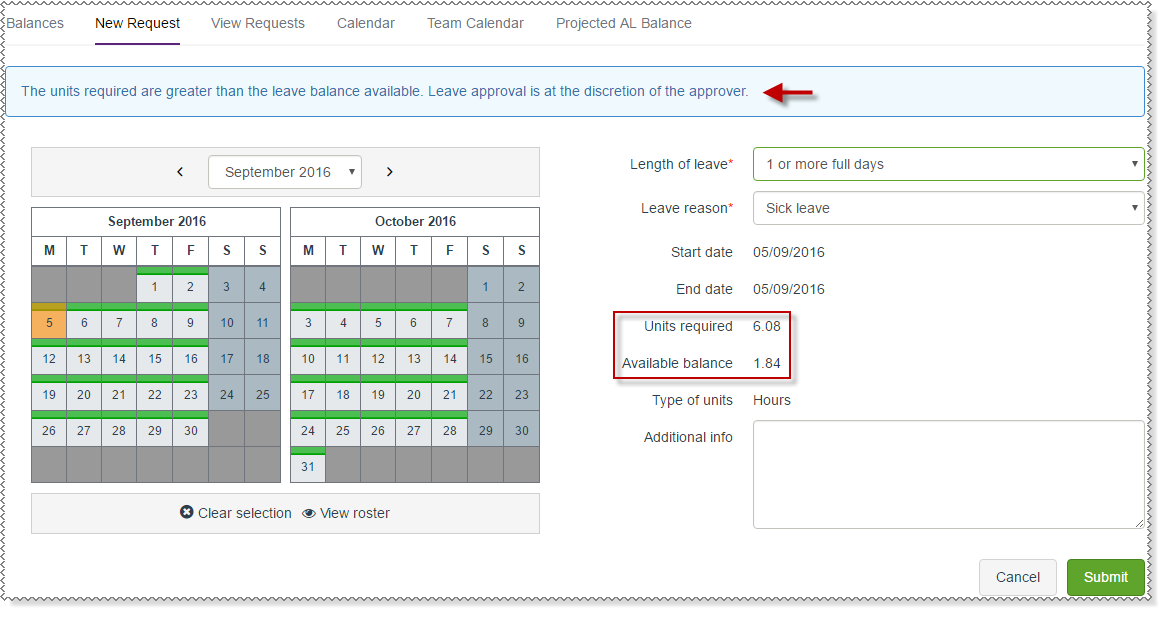 If you are a rostered or profiled employee, then a success message appears and your leave request is submitted to your manager.