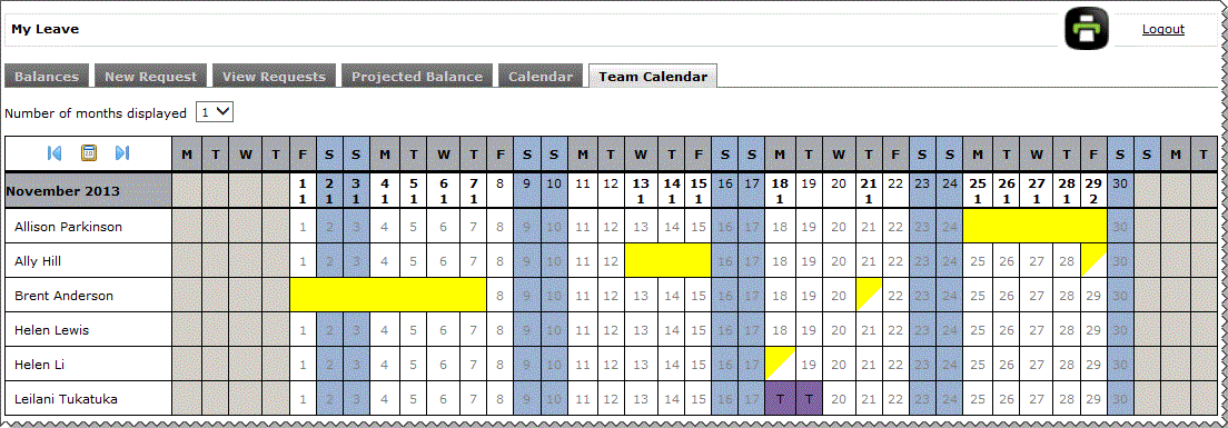 The Team Calendar tab allows you to see when your colleagues are taking leave or are on training. This will enable you to plan your own leave or work more effectively.