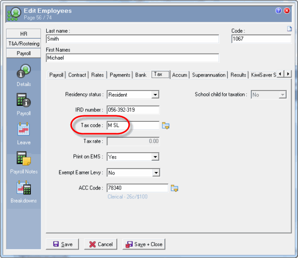 If an employee needs to make student loan repayments, you must select the relevant Tax code in their record. Tax codes with "SL" indicate that an employee has a student loan. For example, Michael Smith's tax code is M SL.